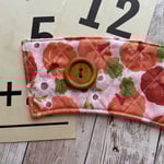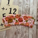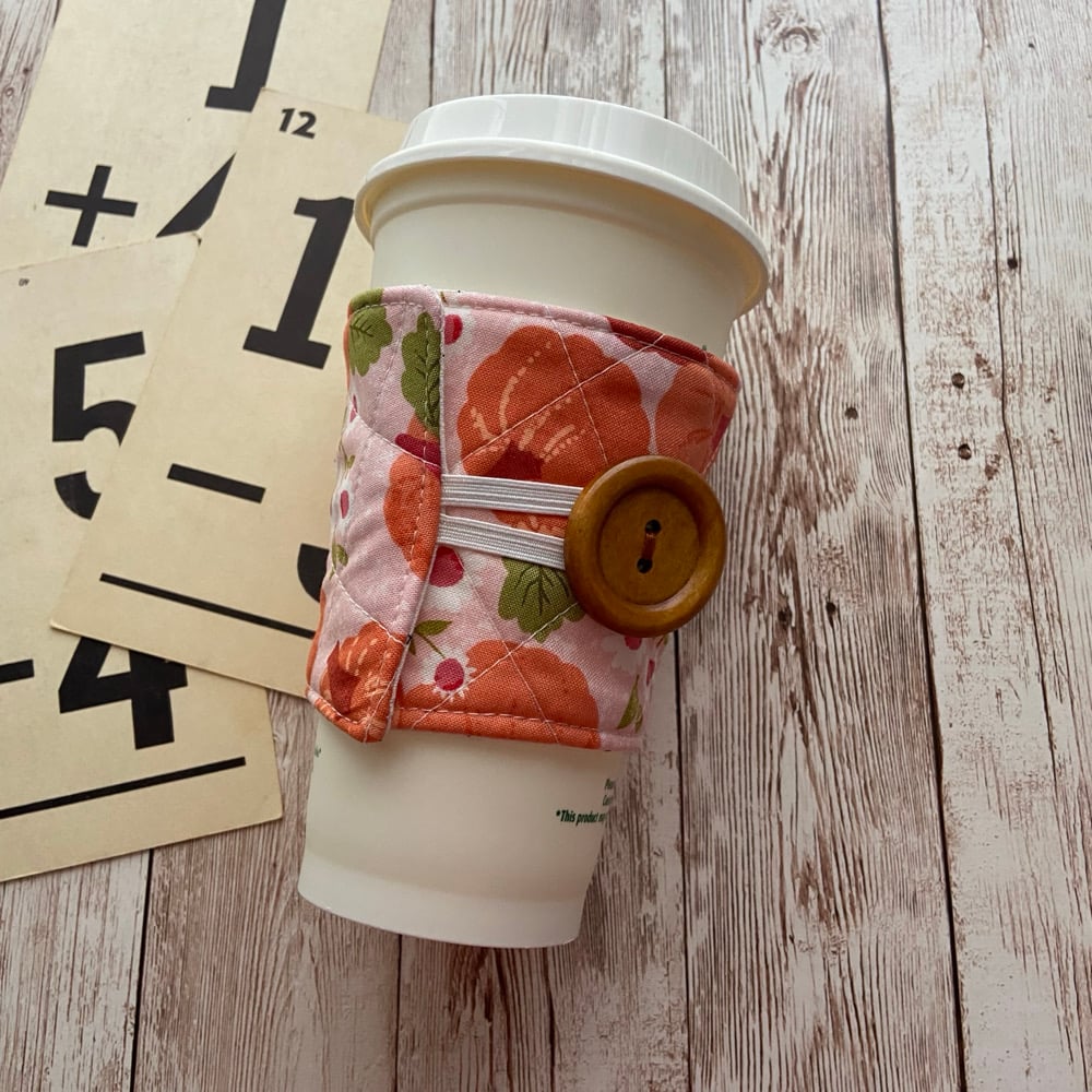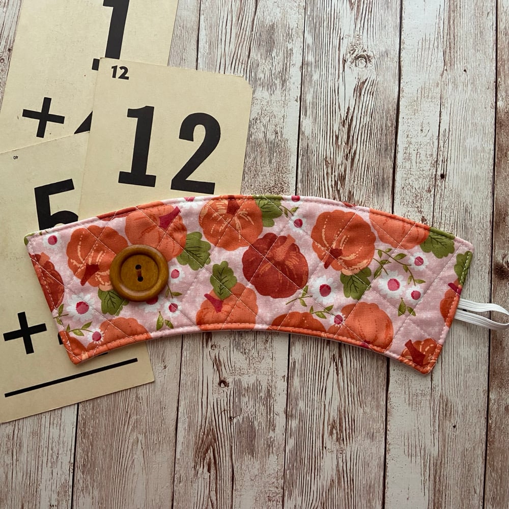 This listing is for a single hot/cold cup cozy in “Coral Pink Pumpkins”.